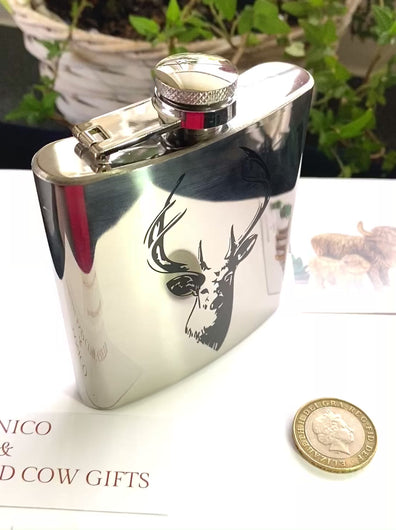 This 6oz Stainless Steel Hip Flask with a majestic Stag measures approx 11cm x 9.3cm x 2.2cm and is presented in a Black Gift Box.