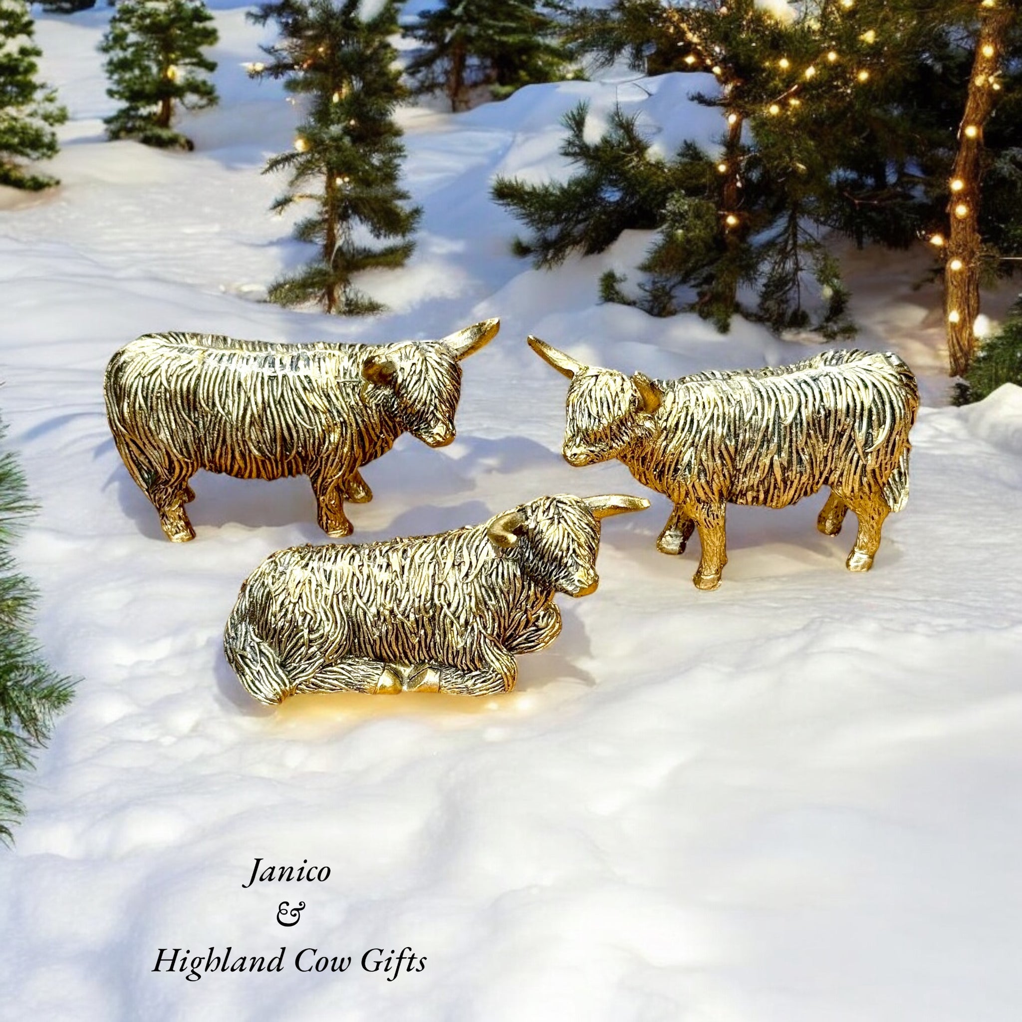 This delightful set of 3 miniature Highland Cows will be the perfect addition to your collection in any setting. It consists of 2 standing and 1 lying down.